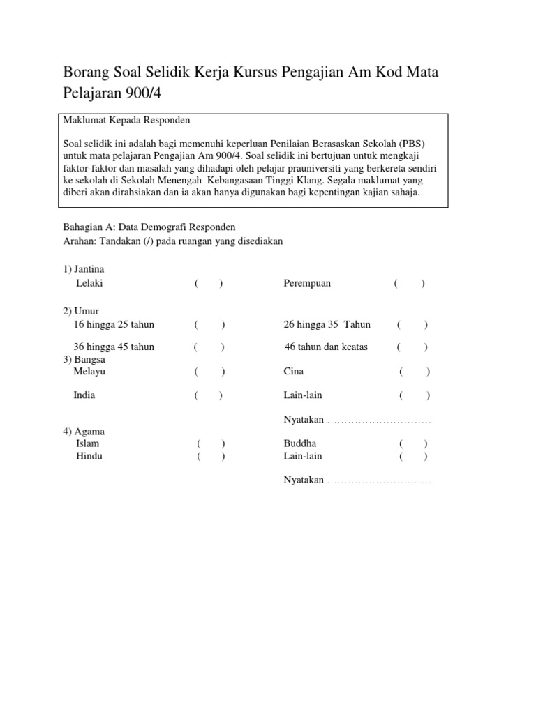 Doc Borang Soal Selidik Kerja Kursus Pengajian Am Kod Mata Pelajaran 900 4 Bahagian A Data Demografi Responden Chrys Annie Rayvious Academia Edu